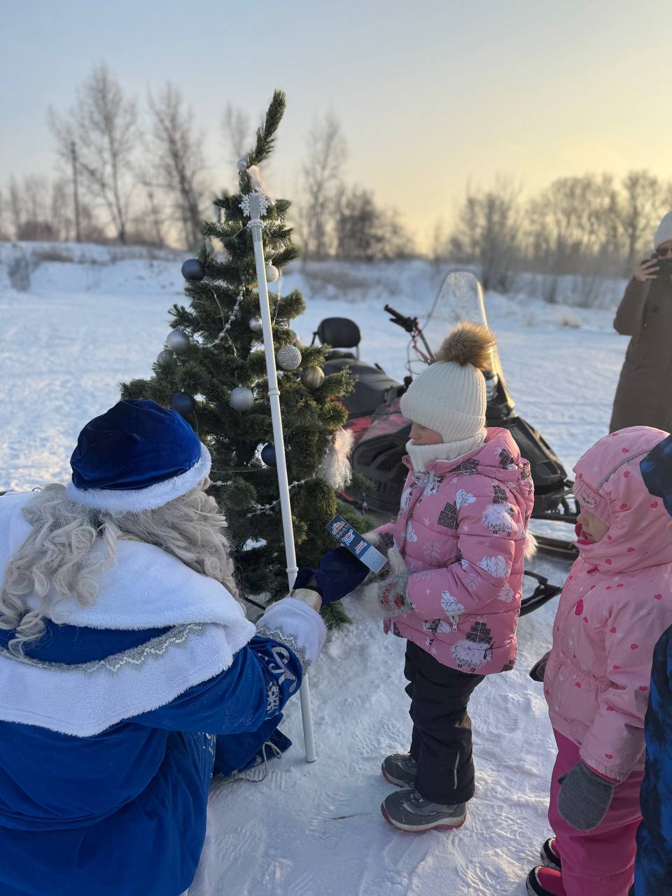 Родители с детьми заезжают в лес на снегоходах! Во время прогулки Вас ожидает волшебная встреча - из глубины леса выйдет Дед Мороз и Снегурочка!